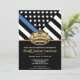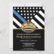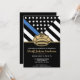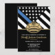 Denna design har en polisflagga med svarta och vita ränder, samt en tunn blå rand också. Polishatten och den gyllene texten sitter ovanför all information om festen för den pensionerade polisen, sheriffen, kaptenen eller polischefens pensionsfest.
