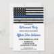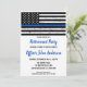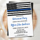 Tunn blå linje inbjudningskort för pensionering av poliser eller inbjudan till poliskursexamensfirande. Fira års tjänst eller fira din nya poliselev, och inbjuda vänner och familj till din fest med detta inbjudningskort i Tunn blå linje-flaggans färger med amerikansk flagga - slitna design. Denna inbjudan till polisens pensionering är också perfekt för inbjudan till poliskursexamen, ändra plats i personalisering. Se vår samling för matchande pensionsgåvor till poliser, examensgåvor till poliser, festartiklar och tillbehör. COPYRIGHT © 2021 Judy Burrows, Black Dog Art - Alla rättigheter förbehållna. Inbjudan till polisen pensionering Tunn blå linje.