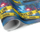 Gult polisband med texten "DO NOT KOR" har en framträdande plats, vilket blockerar synen på en polisbil med blinkande ljus
