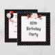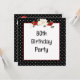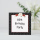 Svart-vit prickig ram med en blomsterbukett och rött band för en inbjudan till 80-årsfest.