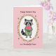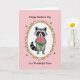 Det här kortet visar ett sött, illustrerat skogsdjur med mjuk grå päls, mörka ansiktsmarkeringar och en randig svans, som står upprätt som om det tar ett steg framåt med tillgivenhet. Det vaggar en bukett ljusröda blommor med smala gröna stjälkar, och dess milda blick antyder en nära, omtänksam relation ❤️. Karaktären sitter inuti en vit oval ram, omgiven av en bladrik grön krans prydd med små rosa blommor och små stjärnliknande detaljer. En ljus pastellrosa bakgrund fyller sidan och håller scenen lugn och öm utan att kännas rörig. Böjd mörkbrun text visas ovanför ovalen och ytterligare en rad sitter under den, snyggt anpassad för att följa ramens form. Blommorna ger den starkaste färgkontrasten och drar blicken direkt till gåvan och varels