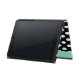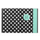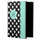 Snyggt iPad Air folio stil fodral med byggt stativ i svartvit polka punkt. Ett myntband, som löper ner högernas front kant och en dekorativ mint grönt, på mitten fronten, har ett svart redo på ett brev för att anpassa sig. Gör en underbar personlig-presentidé.