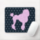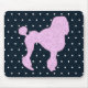 Mycket suddig ljus rosa pudel-apparat på en mörk blått med vit polka dots väv. Utformning av Cute retro 50s stil.