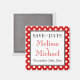 Snyggt anpassningsbar Spara datum magneter för att du aviserade bröllop, designad med vitt polka dots över rött. Ingen minimiorder!