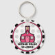 En nyckelkedja med en svart och vit polka-punktbakgrund. Logotyp av Rosa Schoolhouse i shock rosa. Anpassadets text lyder "Second Klass Teacher"