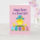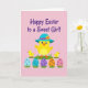 This card shows a cheerful spring scene with a round yellow bird centered on a soft warm pink background, gazing forward with wide eyes and a tiny orange beak. It wears a sky-blue wide-brim hat trimmed with a bright pink ribbon and a small yellow flower, giving it a dressed-up look that feels like it’s ready for a friendly outing. Two smaller yellow birds stand close on either side, angled slightly inward as if keeping the middle bird company in a sweet, companionable moment 🐇. Along the bottom, five decorated eggs sit nestled in short green grass, their polka dots adding a gentle rhythm across the row. The eggs are colored in pastel shades of blue, teal, purple, orange, and rosy pink, balancing the pink backdrop with cool and warm tones. Near the top, a seasonal greeting appears in deep violet lettering, centered above the birds and easy to spot 🌷. The background stays simple with flat color areas and minimal texture so the characters and eggs stand out clearly. The hat’s pink ribbon curves around the brim, and the small yellow flower sits on one side like a neat accent.
