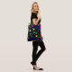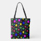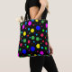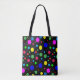 Den här muntra väskan innehåller cirklar i en upplopp av färgstarka bubblor från ballongpolka: gult, grönt, turkos, blått, rött, orange och rosa. Alla ställs in på en svart bakgrund.