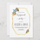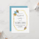 Guldfolie-polygon och seashells inbjudan till förlovningsfest på sommarstrand. Den har ett guld-polygonalt ram med texten och tre vattenfärgssäsonger i beige och blå i det övre lämnat hörnet och en annan i det lämnat grund. Baksidan är av fast blått färg.
