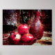 Jordvårdsskiva på en bord. Fyra röda granatfrukter på en platter. En markenware-antique-pitcher till högerna av granater. Mörk bakgrund. Mjuka och friska sommarsnacket.