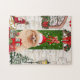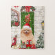 Pommern Hund jul sitta utanför det dekorerade hemmet med julkrans, Julgran är en perfekt julklapp för hundälskare.