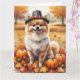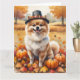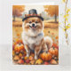 En vattenfärgsmålning stil av ett muntert sitta i hund i en hög av pulserande höst löv, omgiven av små pumpor och spridda hörn. Hund bär lite pilgrimhatt och beams med glädje, och fångade Thanksgivingens anda. I bakgrunden skapar mjuk skörd fält och träd med gyllene hud en fredlig landskapsambians. Struktur och varma, nedsmutsade hösttonar ge är en mysigt, nostalgisk perfekt för att fira säsongens skönhet.