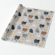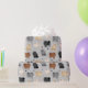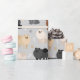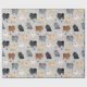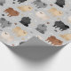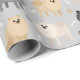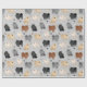 Cute Pommern-hundar i svart, grått, grädde, choklad och rött jackar sitta och stå med utspridda hund-ben och tass avtryck på lätt grått-bakgrund.