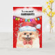 En vacker gult vattenfärg Pommern; leksak pom hund bär en röd och vit faux-fluffy-tomhatt och en röd bågslips. Han är kantad av faux mousserande glitter, en röd bakgrund och har en vit tal bubbla och flerfärgad julsträng ljus som hänger under bubblan. Det inre budskapet lyder: "Önskar en festlig och glad jul. Du fyller mitt hjärta med glädje, lycka och kärlek. Kärlek till måne och tillbaka! Ha en PAWSITIVELY lycklig helgdag! Utomhusmedlemmen och insidan av julafton hälsning kan ändras till något som helst till kostym.