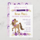 Festinbjudan för en häst- eller ponnytematisk födelsedag eller bröllopsfest i lila och guld. Kontakta säljaren för anpassade färgalternativ.