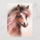 This cute pony postcard features a watercolor painting of a young horse, capturing the elegance and beauty of this majestic animal. The horse's expressive eyes and delicate facial features are highlighted by a warm, natural brown coat with a streak of white, all contrasting with an unusual pink-tinted mane. Perfect for equestrian enthusiasts and animal lovers.