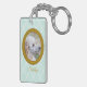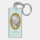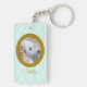 This Poodle photo keychain showcases the phrase “Forever My Best Friend” above your dog’s portrait in an antique-style frame on a soft mint diamond background.