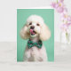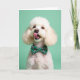 This card shows a close-up, nearly head-on view of a fluffy white poodle-type dog that fills the frame with an inviting presence. Its ivory fur looks freshly groomed against a soft mint-green background, and the gentle contrast makes the face feel extra close, like it’s leaning in to say hello. Dark brown eyes hold a tender, attentive look that feels like loyal friendship, while a little pink tongue peeks out in a sweet, teasing way 💚. A forest-green plaid bow tie sits neatly at the neck, adding a dressed-up touch that suggests it’s ready for a St. Patrick’s Day date or a cozy get-together ☘️. Bright, even lighting adds soft shadows in the curls without pulling attention away from the dog’s expression. Along the top, “Happy St. Patrick’s Day” appears in medium-green lettering, centered and easy to read against the mint background. The mint backdrop stays smooth and uncluttered, making the green bow tie and the dog’s dark eyes stand out.