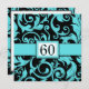 Poolblå och svarta 60-årsfödelsedagsinbjudningar - varje inbjudan har ett blombladsmönster i poolblått på svart bakgrund. Framsidan har också ett poolblått band med ett fyrkantigt monogram som visar 60 med elegant skrivstil med poolblå skuggtext och svart överst. Dessa inbjudningar är tryckta på högkvalitativt vanligt kartongpapper, men du kan byta till linnepapper, filt (präglat), återvunnet papper och flera metalliska nyanser om du vill under nummer 2 (välj stil, storlek och papperstyp) nedanför den orangea knappen "Lägg i varukorgen". En lista över merkostnader för finare kartongpapper visas också under det alternativet. Varje inbjudan levereras med ett anpassat vitt kuvert. Observera att Zazzles förhandsvisningar är komprimerade för att förhindra konststöld, så röda, orange och vissa gr