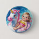 A cute young girl gently drifts on a pink and white unicorn float, gliding across a crystal-clear, blue swimming pool.
