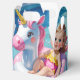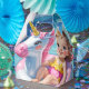 A cute young girl gently drifts on a pink and white unicorn float, gliding across a crystal-clear, blue swimming pool.