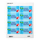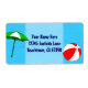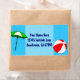 En anpassad etikett med blå bokstäver och rolig strand eller pool tema konst med en röd boll, grön solparasoll på en blå vattenbakgrund med vågor. Anpassa den för att ändra typsnitt, element, etikettstorlek med mera, och spara din design för senare.