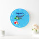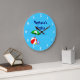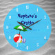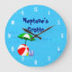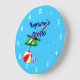 En anpassad klocka med rolig konst av viktiga leksaker för stranden eller poolen, en röd strandboll, grön parasoll, sandaler och sololja på en blå bakgrund med lockiga vågor och valfria vita siffror. Klicka på Anpassa för att ändra teckensnitt, färger och till och med spara din design för senare.