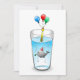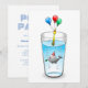 Poolparty födelseinbjudan med en söt illustration av en liten val. Valen har en röd-vitrandig födelsedagsmössa på sig och har startat födelsedagsfesten som äger rum i ett fullt vattenglas.