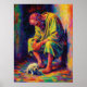 Touching and colorful oil painting of a homeless elderly man in a tattered yellow robe, sitting happily with his loyal small white dog at his feet. Vibrant rainbow brushstrokes and warm palette convey joy, companionship, and contentment in simplicity. Perfect inspirational wall art for home, office, or animal lovers seeking emotional, uplifting decor. High-quality print captures the vivid colors and heartfelt moment.