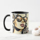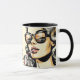 Personlig kaffe kopp. Söt tecknad bok pottretro på söt dam drickssoda med solglasögon på med solnedgång.