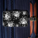 Ett svart och vitt skapande av en vit blomma. Denna unika bagagetapp bör vara lätt att identifiera resväskan vid bagageanspråket.