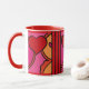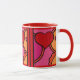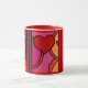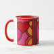 Vilken Roligt! Det finns bara något så lycklig och ljust om utformningen på detta underbara keramiska mugg, som gör det omöjligt att inte le! Leslie Sigal Javoreks originalteckning finns i en abstrakt, popkonst stil med ketchupröda hjärtan och ljusa, varma toner av shock rosa, orange och svarta konturer mot starkt vitt porslin.