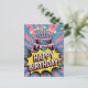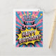 Denna livfulla och roliga bild visar en tvådelad födelsedagstårta med brinnande ljus, renderad i en djärv popkonststil med rosa och blå radiella linjer och halvtone-mönster. En gul pratbubbla brister ut med orden "GRATTIS PÅ FÖDELSEDAGEN!" i ett dynamiskt, serietidningsinspirerat teckensnitt.