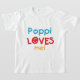 Poppi Kärlek Me T-shirts, kort, klistermärken, kokokocksväskor och annat med färgstarkt rött, gult och blå text och hjärtdesign. Poppi Kärlek, mina kläder och presentartiklar gör poppi-leende!