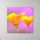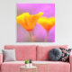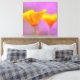 Två pulserande kaliforniska vallmoblommor står mot en mjuk, suddig bakgrund av lila hues. Blomens blad i fokus är delikat detaljerade, medan den andra blomman är något ur fokus, vilket ökar bildens djup. Stammarna är slender och grönt, som sträcker sig från blommornas bas.