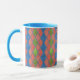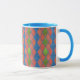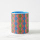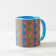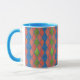 En chic Ringer Coffee Mugg med ett pulverblått lock och handtag och ett Faux-lappverk mönster med diamantformer i Poppy Red, Löv Grönt och Royal Blue. Del av insamlingen "Poppy Fält".