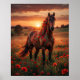 A magnificent poppy horse races across open fields where freedom meets vivid floral beauty. Realistic horse anatomy blends with scarlet poppy petals, flowing stems, bright leaves, and dynamic mane textures full of movement. Golden grasses, rolling hills, drifting petals, and glowing sunset skies create an uplifting countryside atmosphere rich with warmth and energy. This premium fantasy equine design adds bold elegance to living rooms, bedrooms, offices, or gift collections. Perfect for horse lovers, floral decor fans, and statement rustic interiors.