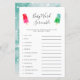 Kute popsikeltema könsneutrala babyduschkort i baby ord med vattenfärgad illustration av färgstarka isproppar. Listan över ord på detta kort gäller spädbarn, och den är uppdelad. Gästerna kommer att tävla, som kan lösa upp alla först! SVAR NYCKEL: 1. bilsäte 2. mjölk 3. lekplats 4. nappar 5. blöjor 6. rockstol 7. dagis 8. baby monitor 9. svalg 10. formel 11. gummiducky 12. barnvagn.