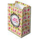 En presentpåse i personlig grattis på födelsedagen med en bild av ett summerat mönster med popsiklar och glass i vattenfärger. Färglöst vibrerande färg som rosa och kalkgrönt. Grattis på födelsedagen och mottagarna namn i ett litet cirkulärt ram.