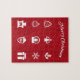 Ett exempel på trendig, modernt och festligt tema. Bilden har en uppsättning med 9 julklamikoner. Bakgrunden är röd med en svag mönster av olika populära julklamsymboler. Ovanpå den röda bakgrunden i fetstilt, ljust vitt, finns några fler säsong-julikoner, bland annat en snöflinga, ängel, inslagen gåva, Santa ansikte, sprit av gräs, en snö-globe, en varm kamera, ett dekorerat julgran och ett prydnadsföremål. God jul är skrivet högst upp i ett glansigt vitt teckensnitt. Cute, trendig och roligt.