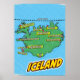 En popkonst stil karta i Island med ljusblå bakgrund och prickad mönster. Karta är självt en grönt med svarta konturer och har olika städer och städer med röda prickar och bubblor från gult tal. Städernas namn är skrivet i fetstilt vitt brev inuti bubblorna i tal.