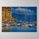 Detta vackra fotografi visar de färgstarka husen och hamnen i Portofino, Italien med Sea Dream-frakten i bakgrunden