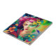 A woman adorned with colorful flowers looks thoughtfully away. The composition blends vibrant floral elements with vivid colors, creating a striking visual effect.