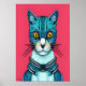 Porträtt av en söt och vacker blå katt på en röd bakgrund. Det här är en AI-skapad konst.