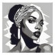 Denna digitala målning visar ett porträtt av en svart kvinna. Kvinnan tittar direkt på betraktaren och har ett lugnt och självconfident uttryck. Hennes hud är en rik, mörkbrun, och hennes hår är stiliserat på ett enkelt sätt