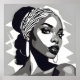 Den här digitala målningen är en porträtt av en svart kvinna. Kvinnan tittar direkt på tittaren och hon har en lugn och ett självsäkert uttryck. Hennes hud är en rik, mörk brun, och hennes hår är format i en enkel