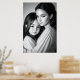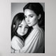 En svart och vit porträtt av mor och dotter med långt svart hår där båda hade vita kläder. Det här är en AI-skapad konst.