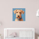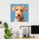 Konstruktion av ett brunt hund med uttryckligt ögon, med blått halsband, mot en fast blå bakgrund, som projicerar värme och ett vänskapligt beteende.