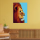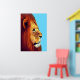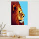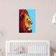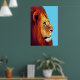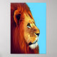 Porträtt av en söt och ädel lejon på blå bakgrund. Det här är en AI-skapad konst.