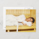 Porträtt om en ung kvinna som ljuger i en bastu vykort