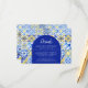 Denna rustika design har ett bakgrundsmönster av blå, gula och vita akvarellportugisiska kakelplattor, eller azulejos. Ordet "Detaljer" visas i elegant vit skrivstil på en blå valvform. Anpassa kortet med information till dina gäster i vit kopparstick-fontän. Ett matchande kakelmönster visas på baksidan.